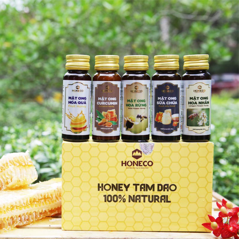 Set quà mật ong Tam Đảo Phú Quý của Công ty Cổ phần Ong Tam Đảo – HONECO bao gồm các dòng sản phẩm mới lạ, độc đáo được phát triển dựa trên mật ong truyền thống, giúp người tiêu dùng trải nghiệm nhiều hương vị ngọt ngào được chế biến từ mật ong nguyên chất. Hộp quà Mật ong Tam Đảo Phú Quý bao gồm 09 sản phẩm: 02 lọ mật ong hoa quả 45g, 02 lọ mật ong sữa chúa 45g, 02 lọ mật ong hoa rừng 45g, 02 lọ mật ong quất Tam Đảo 45g và 01 lọ mật ong Curcumin 45g. Món quà mật ong Tam Đảo này có thể thay bạn gửi đến người nhận những lời chúc sức khỏe, phú quý, bình an ý nghĩa nhất.