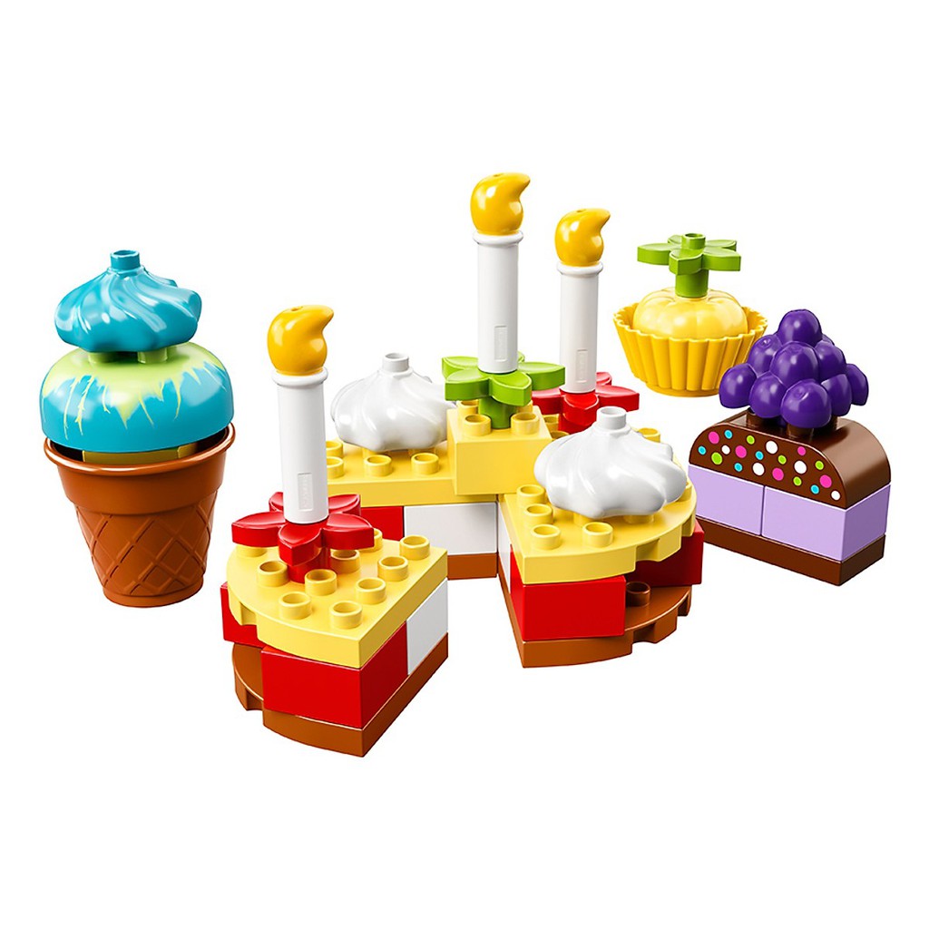 Bộ LEGO Duplo 10862 có tên Bữa tiệc sinh nhật đầu tiên được sản xuất từ chất liệu nhựa nguyên sinh cao cấp. Bộ LEGO có 41 chi tiết có thể ráp thành 1 chiếc bánh kem lớn có kích thước 14x14x14cm và 3 chiếc bánh kem nhỏ kích thước 13x6x6cm, các bánh đều có nến, giúp bé tổ chức một bữa tiệc sinh nhật giả tưởng thật vui.