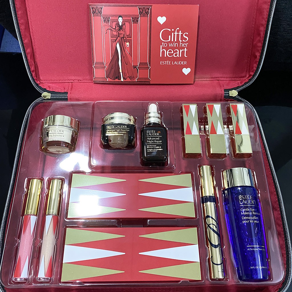 Set quà tặng Estee Lauder gồm có 12 món dưỡng da và trang điểm nổi bật nhất của hãng là: 1 kem dưỡng chống lão hóa Revitalizing Supreme dung tích 15ml, 1 kem dưỡng mắt Advanced Night Repair Eye Supercharged Complex Synchronized Recovery dung tích 15ml, 1 tinh chất chống lão hóa da Advanced Night Repair dung tích 30ml, 3 thỏi son màu Envy Pure Color (màu 111 Tigerr Eye, màu 340 Envious, và màu 420 Rebellious Rose), 2 son dưỡng bóng (màu 330 Red Extrovert và màu 210 Shameless Glow), 2 bảng mắt má hồng Estee Lauder Pure Color Envy Eye And Cheek Palette (màu Glam và màu Nudes), 1 mascara Sumptuous Extreme Lash Multiplying Volume Mascara full size, và 1 nước tẩy trang Gentle Eye Makeup Remover dung tích 100ml. Tất cả được đựng gọn gàng trong một chiếc vali mỹ phẩm cao cấp màu đỏ hết sức "sang chảnh" đảm bảo "hạ gục" mọi trái tim của phái đẹp.