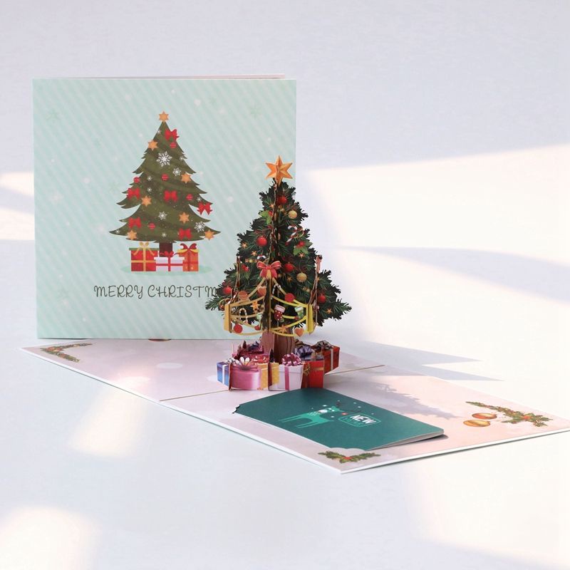 Thiệp Giáng Sinh 3D hình cây thông được làm từ giấy bìa cứng với nhiều màu sắc khác nhau, có thể bảo quản trong thời gian dài mà không bị hư hại, thiệp có phần trống, khi viết bằng bút, bút dầu hoặc bút dạ, thiệp không bị mờ hoặc bẩn. Thiệp Giáng Sinh đã khắc hoạ lại hình ảnh cây thông giáng sinh một cách chân thật nhất. Mỗi tấm thiệp có kích thước là 11x11cm và mỗi phong bì là 11,5x11,5cm. Có rất nhiều không gian để đảm bảo rằng bạn viết tất cả mong muốn của mình cho bạn bè, gia đình.