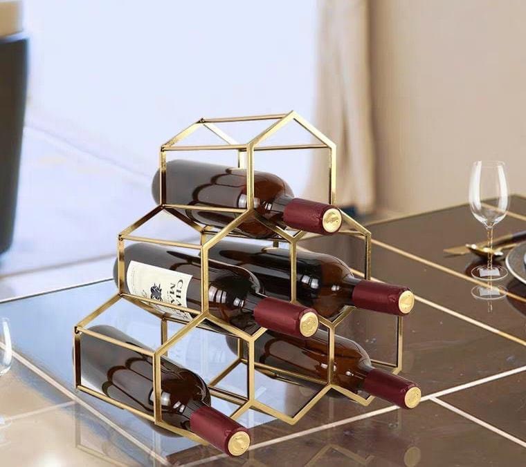 Chiếc kệ được thiết kế dạng hình lục giác, thoạt nhìn thì trông khá đơn giản, nhưng chính sự đơn giản này lại giúp tôn lên vẻ đẹp của các chai rượu vang khi được đặt lên. Sản phẩm được làm từ kim loại không gỉ, sau đó được mạ vàng ánh kim vừa tăng độ bền, vừa tăng thêm sự sang trọng và bắt mắt. Chiếc kệ sẽ giúp việc chưng cất những chai rượu vang hảo hạng được gọn gàng, dễ tìm và là điểm nhấn thú vị trang trí cho phòng khách, phòng ăn của gia đình. Kệ có kích thước là 34x35x17cm tương ứng với chiều cao, dài và rộng.