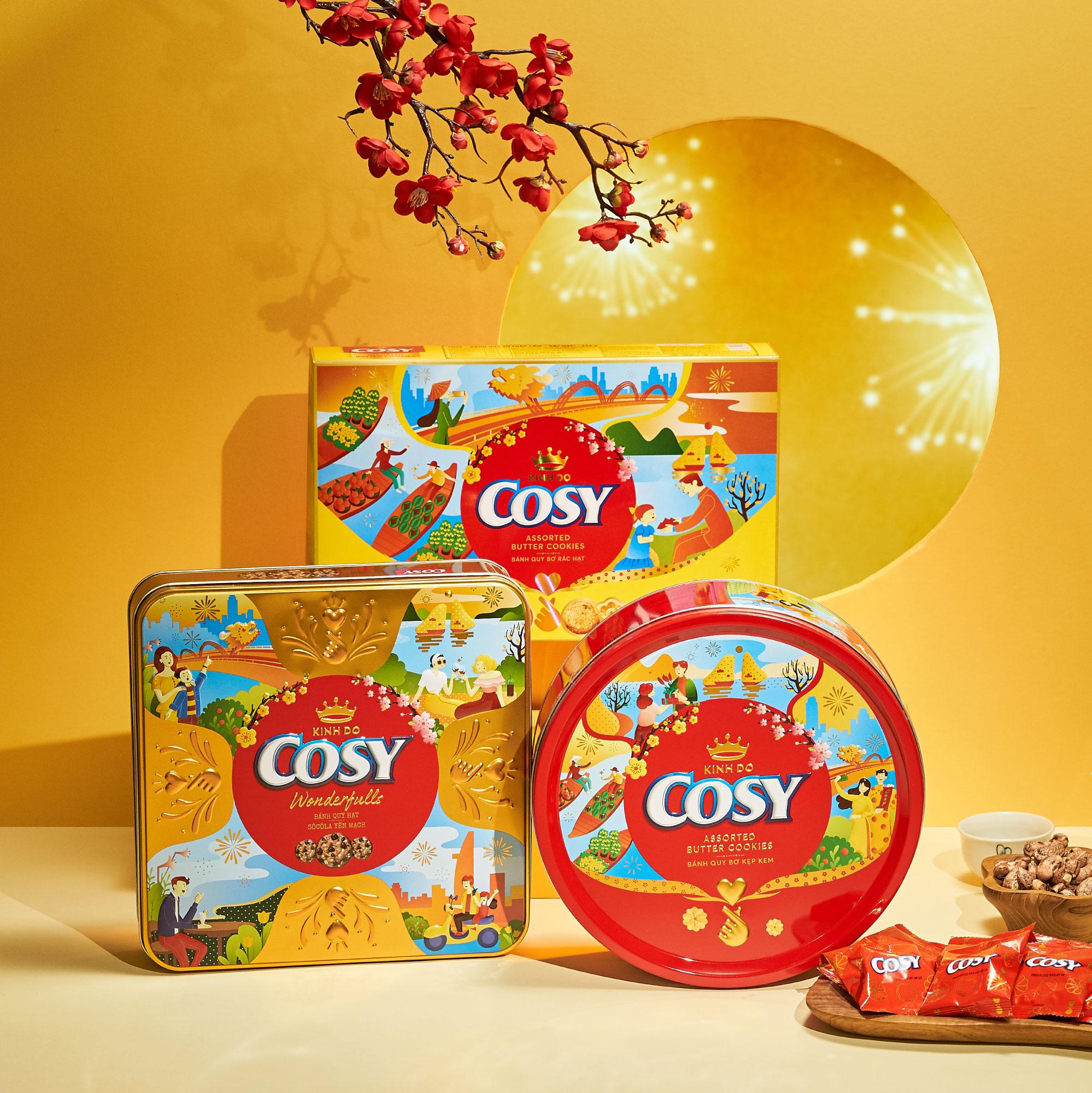 Với độ giòn tan, hương vị sữa béo ngậy nhưng không quá ngọt, cùng hương thơm đặc trưng, Cosy là loại bánh quy yêu thích của rất nhiều trẻ em và người lớn. Có thể nói, Cosy chính là sự hoà quyện tuyệt vời giữa hạt socola cao cấp và yến mạch được nhập khẩu từ Úc, mang đến cho người dùng một trải nghiệm hoàn toàn mới. Trong dịp Tết này, thương hiệu Cosy cho ra mắt sản phẩm Hộp quà Tết Bánh quy Cosy Wonderfulls hạt socola yến mạch với hoạ tiết bao bì đậm nét văn hoá Việt. Đây chắc chắn là siêu phẩm quà tặng để gửi đến những người thân của bạn nhân dịp năm mới.