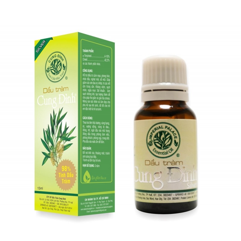 Dầu tràm Cung Đình có hàm lượng tinh dầu Cineol là 42,2% và α-Terpineol 4-10%, chúng là các tinh dầu được chiết xuất ra từ cây tràm gió và có tác dụng điều trị những triệu chứng ở đường hô hấp trên. Sản phẩm có thể được dùng để điều trị ho, cảm lạnh, nhiễm gió, đau bụng, đầy hơi, phòng và điều trị sổ mũi, ngạt mũi. Bạn có thể dùng tinh dầu tràm này để pha nước tắm, xông hơi hoặc bôi ngoài da.