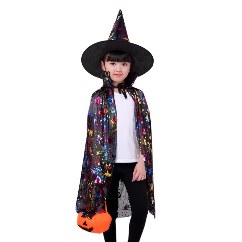 Bộ trang phục hóa trang ngày lễ Halloween cho bé gồm 2 chi tiết là áo choàng và mũ. Áo choàng được làm từ chất liệu vải voan satin mềm mại, nhiều màu, họa tiết sáng lấp lánh rất thu hút ánh nhìn. Chất liệu vải mỏng, nhẹ nhàng đem đến cảm giác thoải mái cho bé khi mặc để thoả sức chơi đùa. Mũ cùng màu được làm từ chất liệu vải dày, chắc chắn. Bộ trang phục tạo sự huyền bí nhưng đáng yêu để bé có thể tham gia các bữa tiệc hoá trang hay lễ hội Halloween cùng bạn bè.