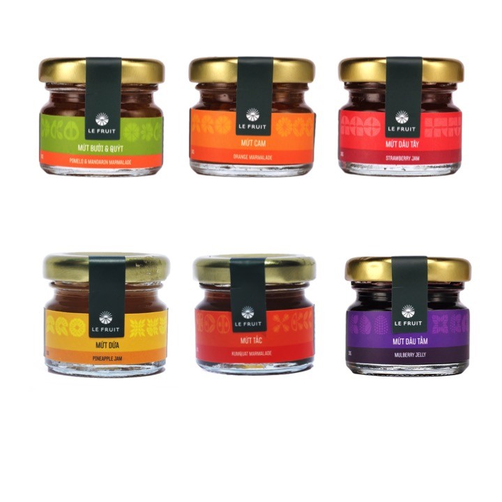Mứt trái cây Le Fruit có nguồn gốc xuất xứ hoàn toàn từ thiên nhiên. Các loại trái cây tươi được chăm sóc cẩn thận, kỹ lưỡng tại khu vực đồng bằng sông Cửu Long, sau đó được chế biến hoàn toàn thủ công theo công nghệ Pháp bằng cách cắt nhỏ tỉ mỉ bằng tay sau đó đem cô đặc từ từ bằng chảo đồng. Dưới bàn tay khéo léo của các nghệ nhân, thành phẩm mứt trái cây Le Fruit đảm bảo được chất lượng tự nhiên hoàn hảo nhất. Mứt trái cây Le Fruit đặc biệt ít đường, không phẩm màu, không chất bảo quản. Set mứt trái cây Le Fruit bao gồm 6 lọ với các hương vị thơm ngon như mứt dâu, mứt dâu tằm, mứt cam, mứt dứa gừng, mứt tắc và mứt bưởi.