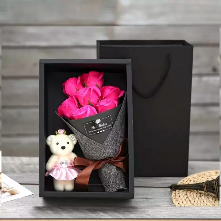Bên cạnh đóa hồng, bạn cũng có thể tặng kèm một tấm thiệp với những lời chúc ngọt ngào dành tặng nàng, hoặc một set hoa hồng sáp thơm kèm gấu lãng mạn này cũng vô cùng tuyệt vời đấy. Hộp quà có màu đen, đi kèm túi xách đen, được đóng gói sang trọng, lịch sự, bên trong là hoa hồng sáp thơm đẹp tự nhiên, mùi hương dễ chịu, chất lượng cao, an toàn với sức khỏe, lưu giữ được bền đẹp lâu dài, cùng với đó là một em gấu bông dễ thương. Chắc chắn món quà lãng mạn này sẽ khiến bạn gái cảm thấy cực kỳ cảm động và hạnh phúc đấy.