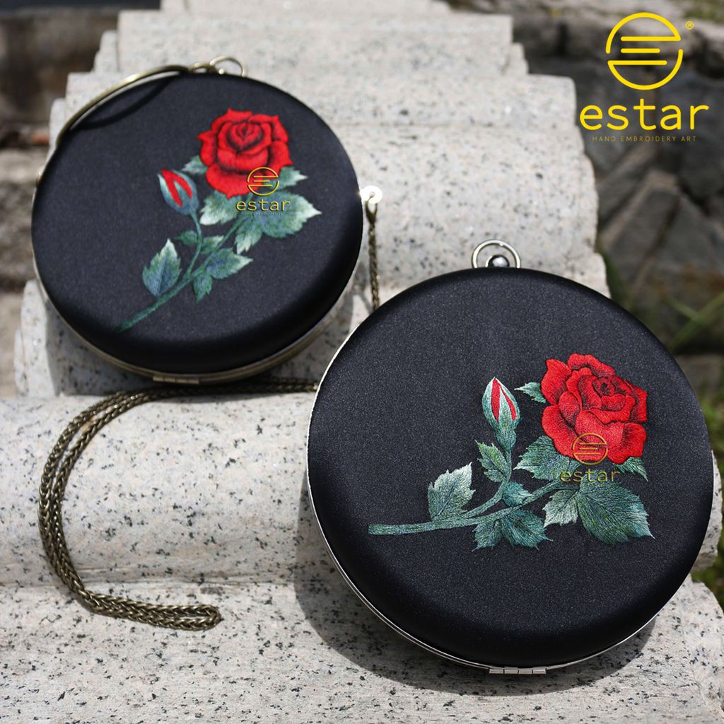 Túi xách thêu tay họa tiết hoa hồng độc đáo Estar là chiếc túi xách được thêu tay hoàn toàn với nhiều công đoạn phức tạp khác nhau. Để có được một sản phẩm ra đời đòi hỏi sự khéo léo, tỉ mỉ đến từ chi tiết mà người làm phải bỏ biết bao tâm huyết vào mỗi đường thêu. Các họa tiết trên túi đều được thêu bằng chỉ tơ bóng – loại chỉ cao cấp có độ thẩm mỹ cao giúp tôn lên được vẻ sang trọng và quý phái. Form túi hình tròn được thiết kế lạ mắt và sáng tạo, có tính ứng dụng cao khi có thể phối được cùng nhiều kiểu và phong cách thời trang khác nhau từ truyền thống đến hiện đại. Bên trong túi còn được may thêm một lớp vải nhung mềm mại và có cả ngăn nhỏ đựng điện thoại và tiền rất tiện lợi.