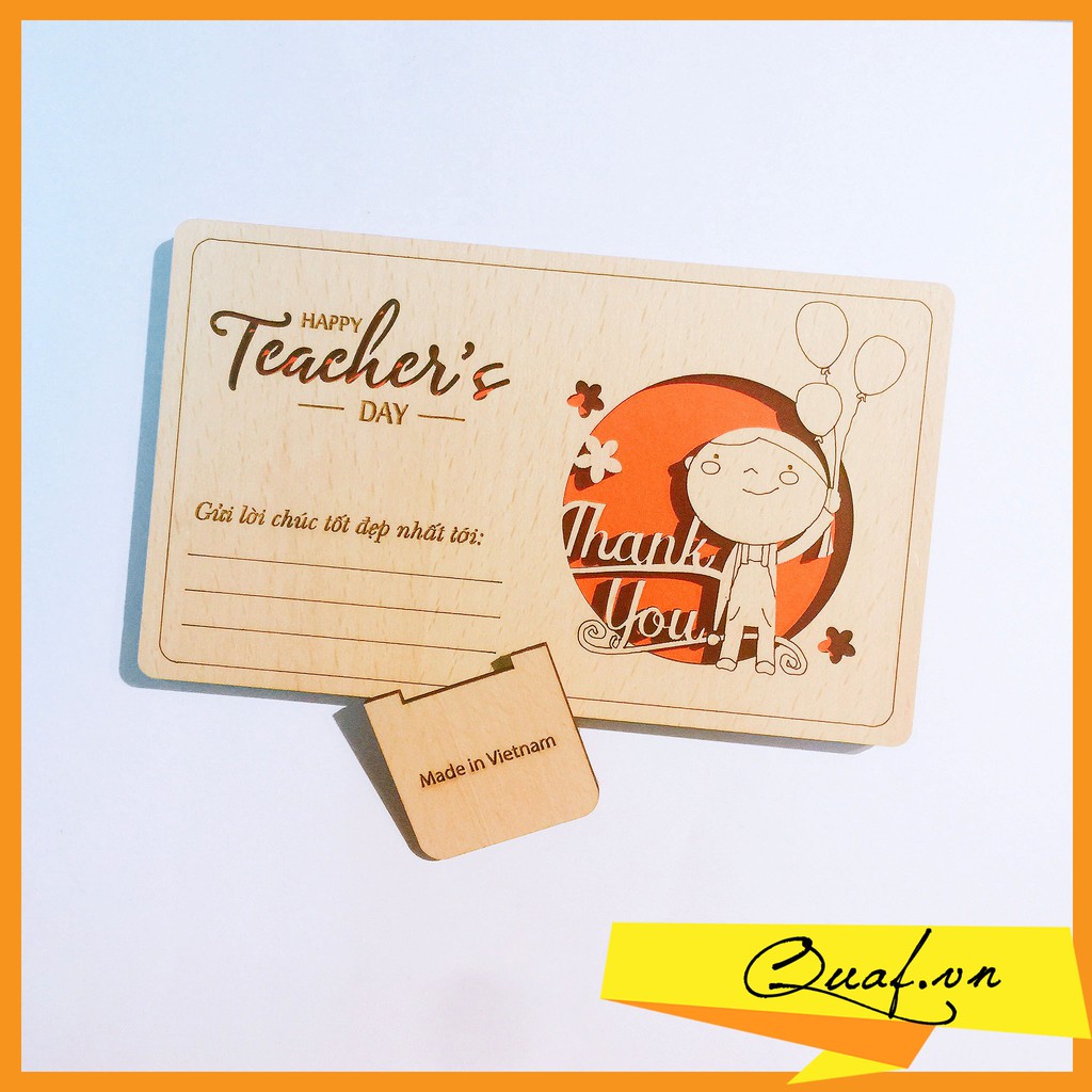 Thiệp 20/11 Handmade Gỗ là một món quà vừa mang tính truyền thống nhưng lại rất sáng tạo mà bạn có thể lựa chọn cho năm nay. Thiệp được sản xuất ngay tại Việt Nam với chất liệu gỗ thân thiện với môi trường. Nhà sản xuất đã cẩn thận lựa chọn gỗ veneer và giấy kraft có chất lượng cao nhất để tiến hành chế tác. Việc này giúp cho tấm thiệp trở nên cứng cáp và sang trọng hơn. Phần khung thiệp được làm từ 2 lớp gỗ dày dặn với những nét khắc lazer sắc sảo, nổi bật những họa tiết và nét chữ như một bức tranh nghệ thuật. Thầy có thể đặt tấm thiệp trên phần chân đi kèm như một bức tranh trang trí cho bàn làm việc hay trong phòng khách. Tờ giấy kraft cao cấp, dày dặn (nhiều màu) đính kèm mỗi tấm thiệp sẽ giúp bạn thoải mái ghi những lời chúc tốt đẹp nhất để gửi đến thầy.