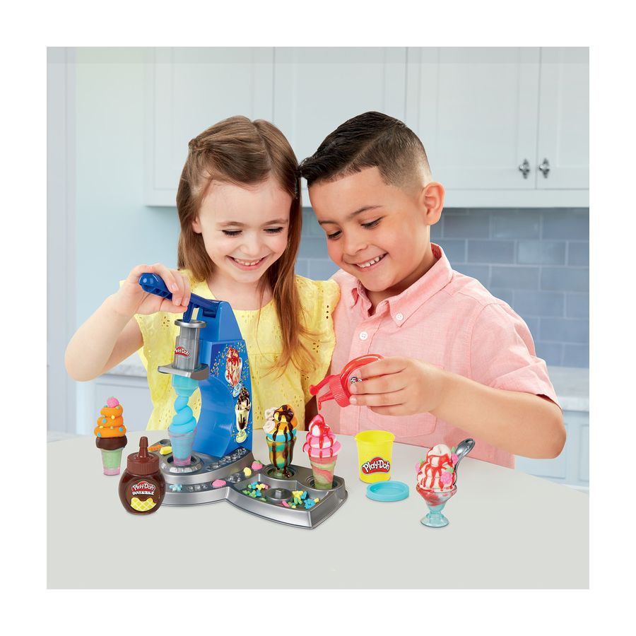 Playdoh là thương hiệu nổi tiếng của Mỹ với các món đồ chơi tạo hình dành cho bé. Đồ chơi được làm từ nguyên liệu đất sét tự nhiên có mùi thơm nhẹ, an toàn, ít bám nên không dính tay hay làm bẩn sàn. Bộ sản phẩm gồm 1 máy làm kem, 6 hộp bột Playdoh, 2 chai nước sốt (dâu, socola), 3 ly đựng kem và 2 thìa sẽ giúp bé chơi an toàn, thoả sức sáng tạo ra những cây kem xinh xắn. Bé sẽ vô cùng thích thú khi được nhập vai người bán kem, tạo ra những cây kem đủ hình thù theo trí tưởng tượng của mình. Bố mẹ có thể cùng tham gia chơi với bé để gia đình có thêm những phút giây gắn kết yêu thương.