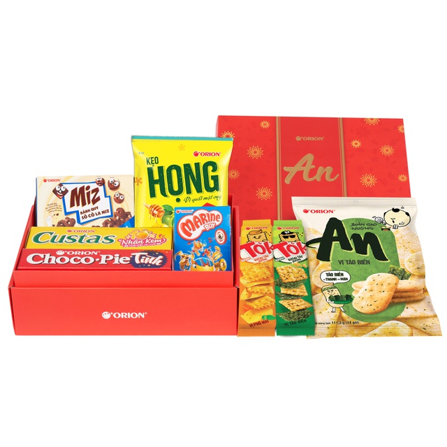 Hộp quà Tết An đến từ thương hiệu Orion là sự kết hợp của nhiều sản phẩm với mẫu mã đa dạng, màu sắc bắt mắt cùng hương vị tuyệt vời. Hộp quà sử dụng màu sắc chủ đạo là Đỏ, kết hợp thiết kế hộp giấy cứng cáp cùng những chi tiết trang trí đậm chất ngày xuân, mang đến vẻ đẹp của sự tươi vui, rộn rã, no ấm và đủ đầy. Gửi tặng người thân hộp quà Tết An, chính là gửi đến họ lời chúc về một năm mới ấm áp, sum vầy, an khang thịnh vượng.