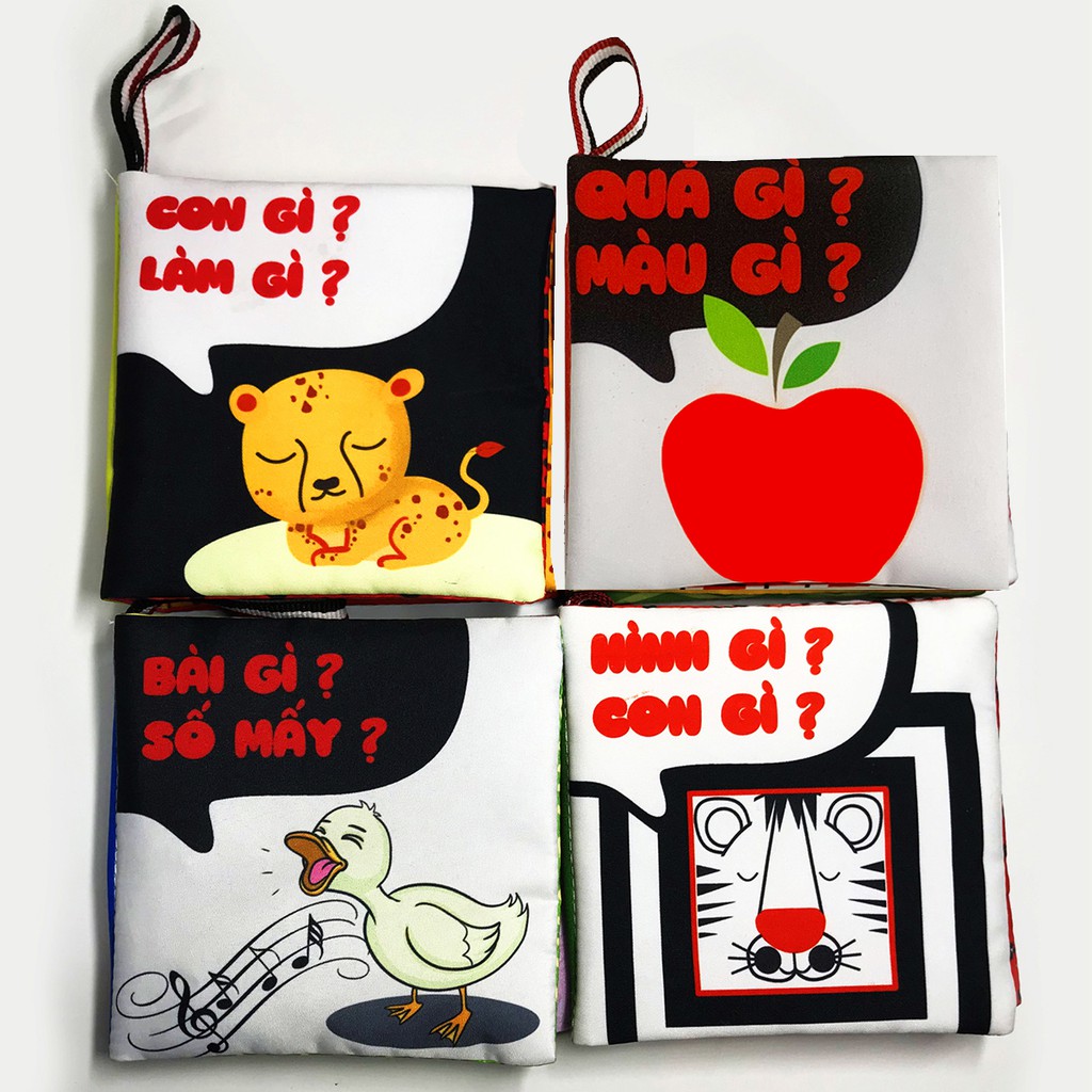 Sách vải song ngữ Việt - Anh kích thích thị giác dành cho bé sơ sinh dưới 1 tuổi là món quà đặc biệt mà ba mẹ có thể dành tặng bé trong Giáng Sinh năm nay. Loại vải được sử dụng làm sách là vải chống nước nên bé có thể thỏa thích khám phá từng trang mà không lo bị rách. Sách có màu sắc nổi bật cùng các chi tiết lật mở thú vị và có cả âm thanh để thu hút sự chú ý của bé. Sách có 4 cuốn với các chủ đề khác nhau sẽ là món quà đầu đời đầy ý nghĩa cho con để tiếp xúc với những loài động vật, hoa quả, màu sắc, số đếm và về hình khối để con phát triển toàn diện các giác quan. Kích thước của sách là 12 x 12 x 3cm với độ dày khoảng 4 đến 8 trang rất phù hợp với các bé sơ sinh vì ở tuổi này con thường chỉ tập trung được không quá 10 phút. Chất liệu vải Polyestes an toàn, mềm mại và không bị bay màu khi vệ sinh cũng là một yếu tố giúp sách trở nên thân thiện hơn với trẻ nhỏ. Đây sẽ là cuốn sách đầu đời đưa con để khám phá màu sắc đa dạng xung quanh cuộc sống.