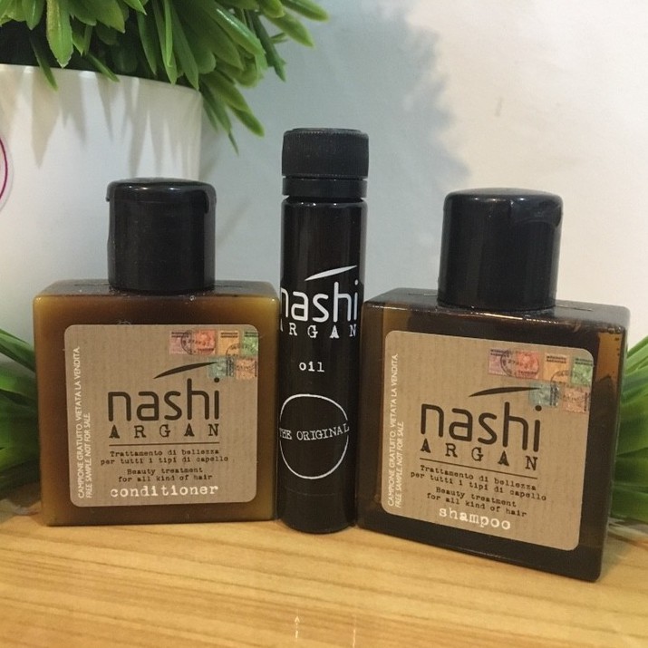 Bộ 3 gồm dầu gội và dầu xả Nashi Argan dung tích 30ml, tinh dầu dưỡng tóc 5ml. Dầu gội có tác dụng loại bỏ các chất bụi bẩn, chất hữu cơ có trên tóc và với công thức độc đáo tái tạo lại mái tóc làm cho mái tóc bóng mượt hơn và tăng sức đề khách cho mái tóc. Đặc biệt dầu gội Nashi Argan luôn bảo vệ và giữ cho màu tóc không bị trôi đi. Dầu xả có tác dụng mạnh đến quá trình phục hồi lại mái tóc bị xơ và hư tổn, đồng thời còn có tác dụng làm sạch, tạo độ ẩm cho da đầu, giữ cho tóc luôn suôn mượt và quyến rũ đặc biệt là các loại tóc xơ tổn cho uốn nhuộm. Cuối cùng là tinh chất dưỡng tóc Nashi Argan được chiết xuất từ quả cây Argania Spinosa có chứa các acid béo không bão hòa, vitamin E, chất chống oxy hóa giúp kích thích mạnh vào các tế bào quan trọng của tóc nhằm nuôi dưỡng, dưỡng ẩm sâu từ bên trong tóc để phục hồi và giúp mái tóc trở nên khỏe và mượt hơn. Ngoài ra bộ chăm sóc tóc Nashi Argan còn chống gàu, nhờn, phục hồi tóc hư tổn, chẻ ngọn và khô.