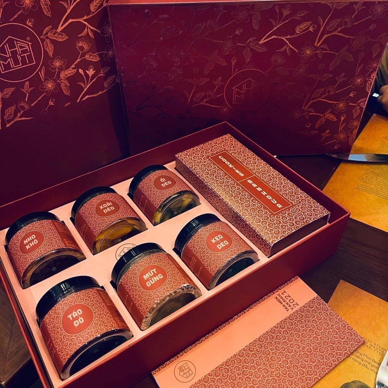 Set quà Tết cao cấp đến từ Nhà Mứt bao gồm 1 hộp có 8 món mứt tượng trưng cho sự phát tài, phát lộc đủ đầy trong năm mới. Sản phẩm sẽ có những loại mứt từ hoa quả như ổi, xoài, nho sấy dẻo cùng với đó là các loại bánh có hương vị thơm ngon mới lại chẳng hạn như bánh dứa, cookie chocolate và kẹo trái cây.