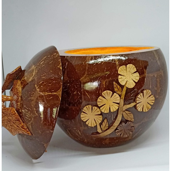 Gáo dừa giữ nhiệt bình trà độc đáo được làm một cách tinh xảo, tỉ mỉ qua đôi bàn tay lành nghề của những người thợ khi cắt ghép từ những mảnh nhỏ gáo dừa để cho ra được thành phẩm là một chiếc gáo dừa giữ nhiệt lớn. Bên ngoài được trang trí và điêu khắc hoa văn hình bông hoa giống như một bức tranh nghệ thuật.