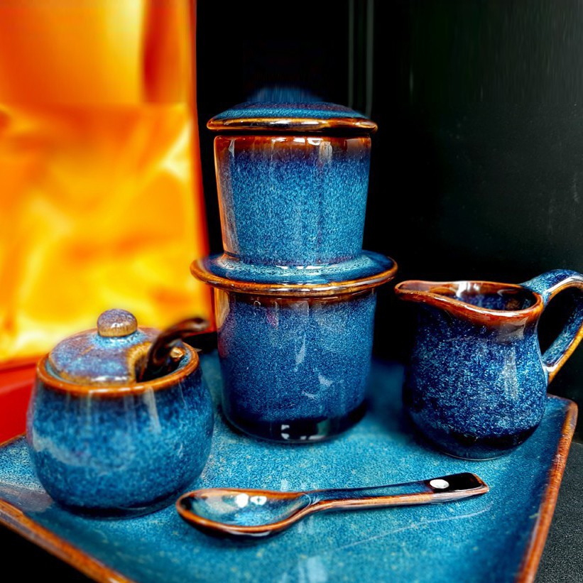 Bộ quà tặng cà phê phin gốm Bát Tràng bao gồm 9 sản phẩm: 1 khay vuông, 1 cốc cà phê, 1 phin pha cà phê, 1 hũ đường và thìa, 1 bình rót sữa, 1 thìa cà phê. Sản phẩm được làm chất liệu gốm Bát Tràng với kĩ thuật nung đặc biệt qua 2 lần nửa và nung ở nhiệt độ cao 1300 độ cùng tinh chất men hỏa biến đã cho ra được những sản phẩm gốm sứ sáng bóng và có độ thẩm mỹ cao.