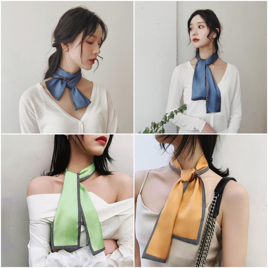 Khăn Turban dài cao cấp được làm từ chất liệu lụa cao cấp, chất cực đẹp sẽ phù hợp để thắt cổ áo, cột tóc hay quấn túi xách. Kết hợp với đường may hai mặt viền dọc đen trắng xung quanh khăn, tạo nên điểm nổi bật và đặc sắc cho khăn. Khăn lụa Turban dài cao cấp có kích thước 98x9cm. Khăn Turban có thể dùng để quấn tóc - mix với đồ hoặc tạo kiểu tóc khi đi chơi dạo phố. Dùng để quấn cổ tay tạo nên sự cá tính, phong cách. Cột túi xách như một phụ kiện trang trí cho chiếc túi của bạn trở nên khác biệt. Hoặc quàng cổ áo sơ mi, tạo điểm nhấn mới cho trang phục của bạn. Ngoài ra, khăn Turban khi mặc với vest hoặc áo sơ mi sẽ tạo nên nét phá cách.