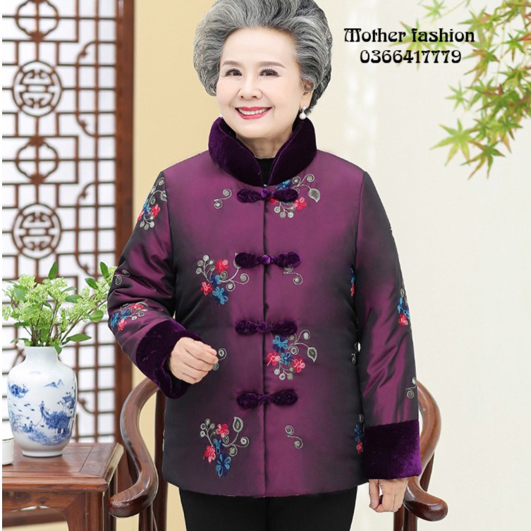 Với thời tiết lạnh, bạn nên chọn trang phục đủ giữ ấm để ông bà không phải mặc quá nhiều lớp, quá bí vì sẽ dễ bị cảm vì mồ hôi trộm. Về chất liệu, cotton là tốt nhất vì mềm mại, thoáng và thấm hút tốt. Chiếc áo phao lót lông cực ấm này sẽ là món quà Tết ý nghĩa để bạn dành tặng bà đấy. Đây là chiếc áo phao hai lớp lót lông cừu nên cực ấm và nhẹ. Tay áo và cổ áo được lót vải nhung sang trọng. Họa tiết hoa được thêu tỉ mỉ trên áo. Áo có màu tím hồng với các size 2XL, 3XL, 4XL (55-75kg).