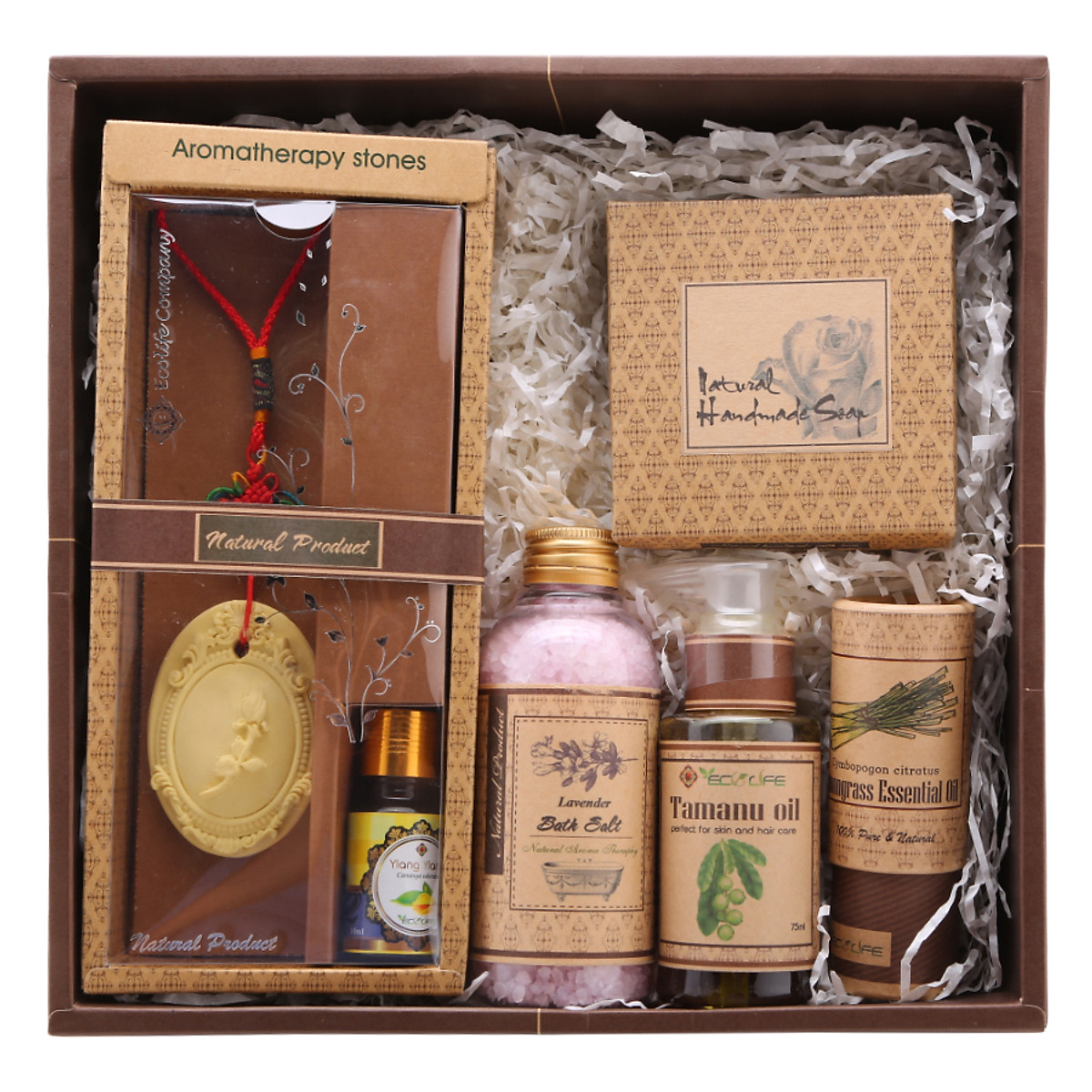 Hộp quà Ecolife bao gồm 5 sản phẩm được thiết kế sáng tạo và tinh tế theo tiêu chuẩn mỹ thuật Hàn Quốc vô cùng xinh đẹp và bắt mắt. Đá thơm Ecolife có tính năng thấm hút tinh dầu giúp hương thơm của sả nhẹ nhàng và dễ chịu lan tỏa trong không khí, khiến tinh thần trở nên thư thái, giúp ngủ ngon, giảm stress, ngoài ra còn làm sạch không khí, khử mùi và chống côn trùng. Xà phòng thiên nhiên Ecolife có thành phần chính là vitamin E, dầu dừa, dầu oliu và tinh dầu hoa hồng giúp dưỡng ẩm, làm mềm và làm sáng da. Muối tắm tinh dầu Ecolife sử dụng thành phần muối biển thiên nhiên giúp tẩy tế bào chết và thải độc cho da hiệu quả, từ đó se nhỏ lỗ chân lông và làm trẻ hóa làn da. Dầu mù u hữu cơ Ecolife có khả năng thần kỳ trong việc thúc đẩy hình thành mô mới, giúp chữa lành vết thương, giảm viêm, diệt khuẩn, hỗ trợ điều trị mụn sưng, chàm, vẩy nến,... Sản phẩm cuối cùng trong bộ quà tặng Ecolife là tinh dầu sả chanh với hương thơm dễ chịu giúp thư giãn, giảm căng thẳng, giải tỏa lo âu, làm ấm cơ thể, thanh lọc không khí hiệu quả.
