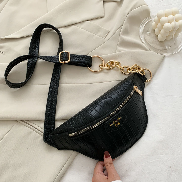 Túi đeo trước ngực, đeo hông cá tính được thiết kế theo form nhỏ gọn, basic tạo cảm giác cá tính nhưng cũng hết sức điệu đà bởi chất liệu làm từ da mềm mại. Túi có 2 ngăn và có dây đeo kết hợp giữa dây da và dây xích có thể tùy ý chỉnh độ dài ngắn. Ưu điểm của những chiếc túi đeo chéo là rất tiện lợi cho di chuyển, đi du lịch có thể dùng túi đeo chéo để đựng các vật dụng cần thiết như điện thoại, sạc pin, ví tiền,...Màu sắc đen, trắng sang trọng và bắt mắt cùng họa tiết da in nổi khiến cho chiếc túi trở nên nổi bật hơn.