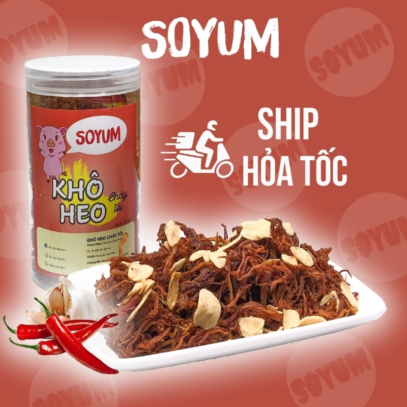 Khô heo cháy tỏi là một món ăn vặt không còn xa lạ gì với hầu hết mọi người bởi hương vị thơm ngon cùng cách sử dụng đa dạng. Bạn có thể ăn trực tiếp trong khi nhâm nhi các loại đồ uống yêu thích hoặc dùng kèm bánh tráng trộn, cơm cháy, làm mồi nhậu lai rai,... hay ăn như một món mặn cùng với cơm, bánh mì, xôi nếp, cháo trắng, mì gói,... đều vô cùng phù hợp. Với tiêu chí chọn lọc nguyên liệu tươi mới một cách kỹ lưỡng, bảo đảm an toàn vệ sinh thực phẩm cũng như giao hàng nhanh chóng đến tận tay thực khách, khô heo cháy tỏi của SoYum xứng đáng là một lựa chọn tuyệt vời dành cho bạn.