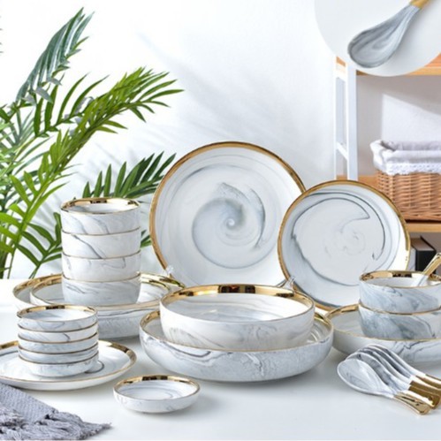 Bộ sản phẩm được làm từ sứ tráng men sáng bóng của chất liệu gốm và men cao cấp. Chi tiết trang trí giả vân đá, viền vàng, thể hiện sự sang trọng, giúp bữa cơm thêm ngon miệng. Bộ tô chén dĩa bao gồm 32 sản phẩm: 6 bát ăn cơm, 6 bát chấm, 6 thìa, 6 đôi đũa vàng, 1 bát tô to, 2 đĩa sâu nhỏ, 2 đĩa nhỡ nông, 2 đĩa to nông, và 1 đĩa đại nông.