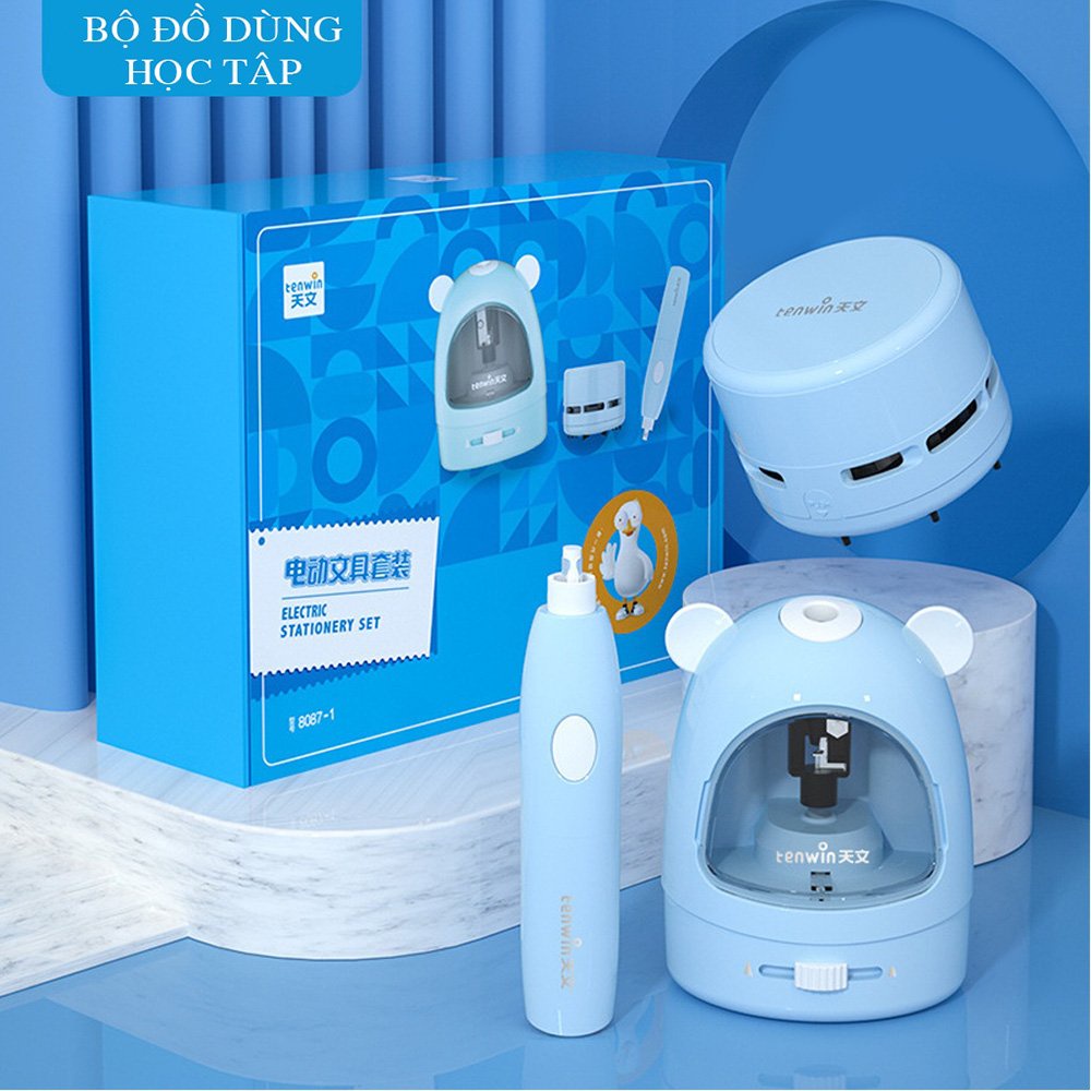 Bộ đồ dùng bút chì điện tử chất lượng cao là bộ dụng cụ học tập gồm máy gọt bút chì, máy hút bụi, gôm điện, 50 cục gôm tẩy chì dành cho bé. Trong đó, gọt bút chì sử dụng lưỡi dao xoắn ốc hạng nặng có khả năng gọt nhanh, được thiết kế với chế độ tự động ngừng làm việc khi ngòi chì đã đạt được độ dài thích hợp. Gôm điện thì được thiết kế để có thể dễ dàng thay thế, tháo lắp cục gôm tẩy mới, cùng với khả năng tẩy cực mạnh chỉ với một nút bấm đơn giản. Còn máy hút bụi thì nhỏ gọn nhưng lại có khả năng nhanh chóng hút sạch bụi bẩn do tẩy gôm gây ra trên giấy. Ngoài ra, tất cả bộ sản phẩm này đều được làm bằng chất liệu nhựa nguyên sinh ABS, vừa an toàn cho bé lại vừa thân thiện với môi trường xung quanh, rất hợp lý đúng không nào?