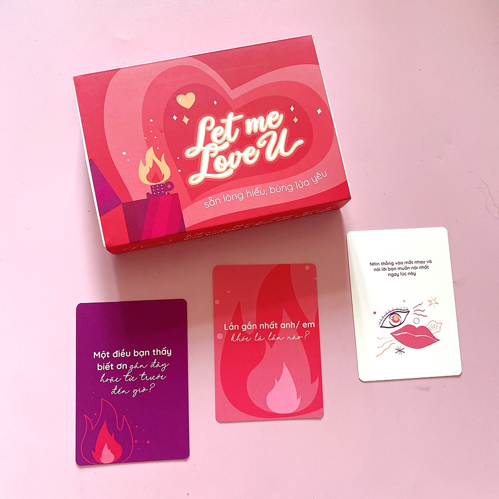Bộ bài Let Me Love You bao gồm các câu hỏi, gợi ý hành động và thông điệp chỉ dẫn, tất cả được thiết kế dựa trên lý thuyết về bảy tấm gương quan hệ và năm ngôn ngữ tình yêu, từ đó giúp mở ra cho bạn không gian tự nhiên nhất để được thể hiện bản thân mình với đối phương, đồng thời lắng nghe đối phương chia sẻ về bản thân họ. Hai bạn sẽ có thể tìm hiểu quan điểm, cuộc sống cá nhân, sở thích, mục tiêu, góc nhìn,... của mỗi người, cũng như có thêm những khoảnh khắc và kỷ niệm đáng nhớ bên nhau. Bộ bài Let Me Love You bao gồm 66 thẻ bài, với 40 thẻ câu hỏi thấu hiểu mình và người ấy, 10 thẻ hành động tăng gắn kết, 14 thẻ thông điệp, chỉ dẫn và lời khuyên cho chuyện tình cảm, cùng 2 thẻ bài cá nhân hóa để bạn tùy ý sáng tạo.