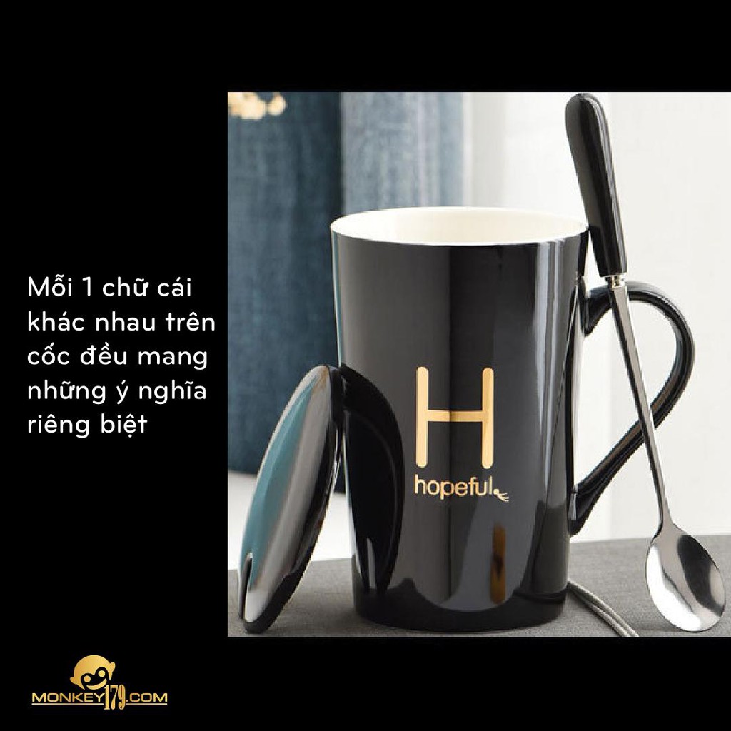 Những chiếc cốc sứ chịu nhiệt với kích thước 8,5x12,5cm được phủ men đen tuyền bên ngoài giúp nổi bật những chữ cái màu vàng nhiều ý nghĩa như H (Hopeful - Hy vọng), L (Lucky - May mắn)... Chiếc cốc có nắp và muỗng inox đi kèm vô cùng tiện lợi, giúp người dùng thoải mái thưởng thức những ly nước ép mát lạnh vào mùa hè hay những ly trà ấm áp vào mùa đông. Đặc biệt, trong tiết trời lạnh giá thì chiếc cốc không chỉ chứa thức uống nóng hổi mà còn có thể là vật sưởi ấm cho đôi bàn tay vô cùng hiệu quả đấy. Tổng thể chiếc cốc được thiết kế đẹp mắt với một màu đen vô cùng sang trọng và tinh tế sẽ rất nổi bật khi đặt trên bàn làm việc hay bàn uống nước. Đây chắc chắn là món quà thích hợp cho hầu hết những dịp sinh nhật hay lễ tết mà bạn nên lựa chọn.