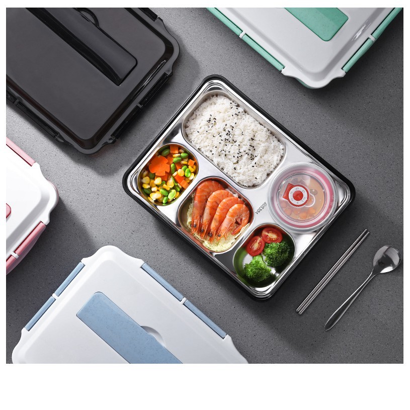 Vỏ hộp được làm bằng nhựa PP an toàn trong thực phẩm, nắp có đệm gioăng cao su chống tràn luôn đảm bảo thức ăn được lưu trữ an toàn trong hộp mà không bị đổ hay chảy ra ngoài. Đặc biệt, khả năng chịu nhiệt từ -22 đến 400 độ C giúp người sử dụng có thể lưu trữ thực phẩm trong tủ lạnh hay quay trong lò vi sóng đều an toàn. Không chỉ vậy, thiết kế thông minh với nút thông hơi và khay để điện thoại tiện lợi trên nắp hộp giúp người dùng có thể vừa giải trí vừa thưởng thức bữa ăn ngon một cách thoải mái. Khay đựng bằng inox được thiết kế với 5 ngăn dễ dàng đựng riêng nhiều loại thức ăn giúp thực đơn của bữa cơm thêm phong phú.