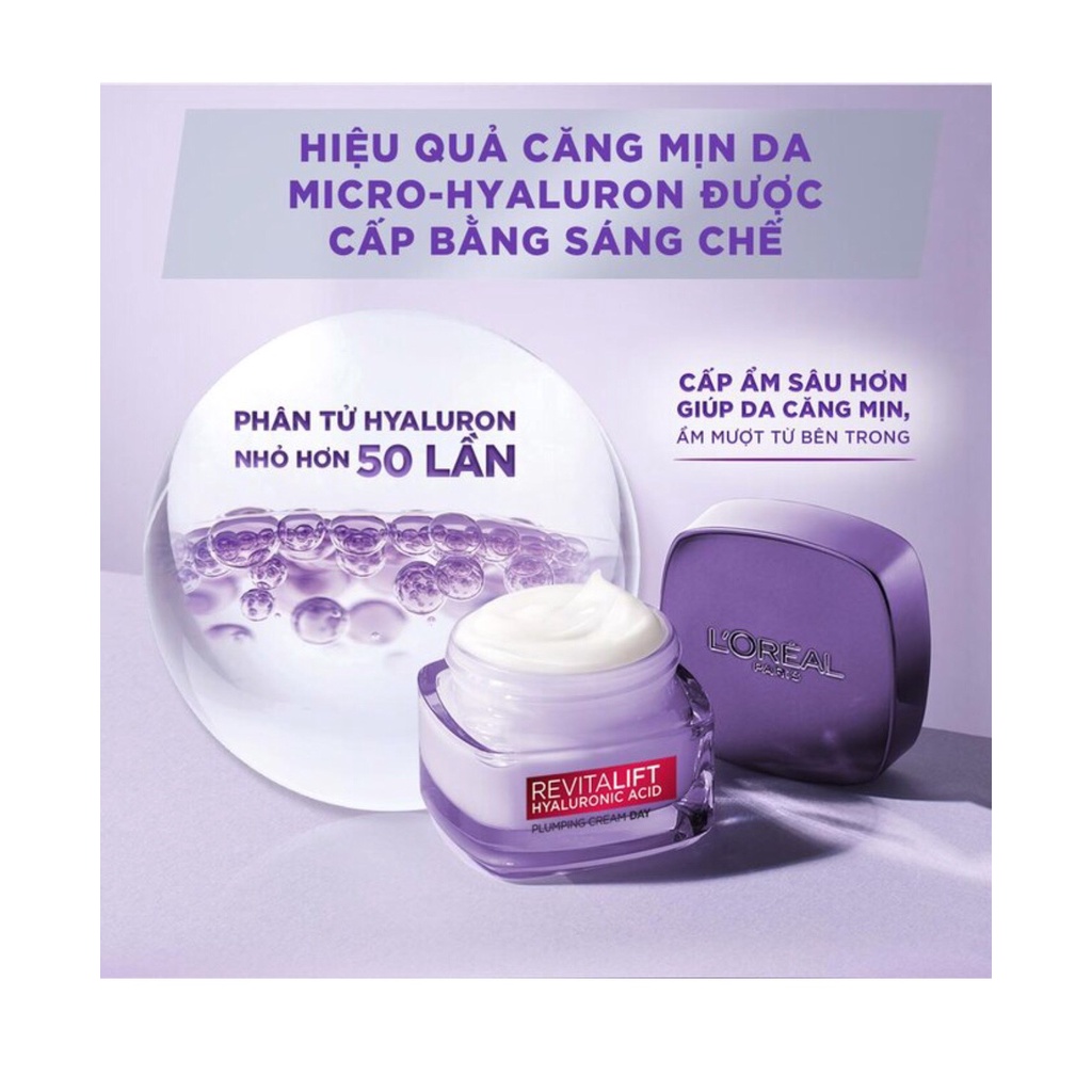 Nếu bạn đang tìm mua 01 sản phẩm dưỡng da ban ngày, hãy thử đến với Kem dưỡng Revitalift Hyaluronic Acid Plumping Day Cream của thương hiệu L'Oréal đến từ “xứ sở rượu vang” (Pháp) nhé! Với ưu điểm chứa 02 loại HA (Hyaluronic Acid) trong cùng 01 sản phẩm nên dòng kem dưỡng này được rất nhiều chị em tìm mua như một liệu pháp cấp ẩm và khôi phục độ đàn hồi cho da đấy!