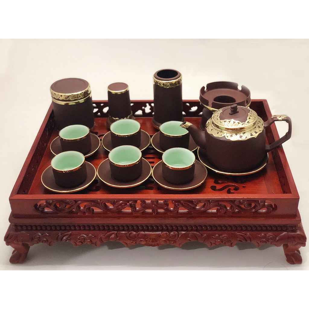Nếu bố bạn có thói quen nhâm nhi một chén trà nóng vào buổi sáng cùng những người hàng xóm, hay khi lật giỏ vài trang báo thì một bộ ấm chén trà là món quà tinh tế mà bạn có thể dành tặng bố đấy. Bộ ấm chén tử sa Bát Tràng được thiết kế bọc đồng men nâu với lòng chén xanh rất nhã nhặn, kiểu dáng tích vai vuông hòa quyện với một chút kiểu dáng bầu tròn truyền thống. Bộ sản phẩm đầy đủ gồm có 8 món chuyên dùng khi uống trà.