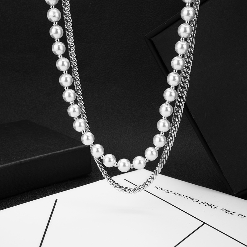 4. Vòng cổ nam nữ hip hop hai lớp bằng titan không gỉ phối ngọc trai nhân tạo
