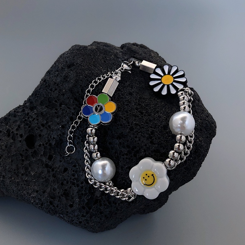 9. Vòng tay chuỗi hạt ngọc trai nhân tạo mặt hoa cúc họa tiết mặt cười
