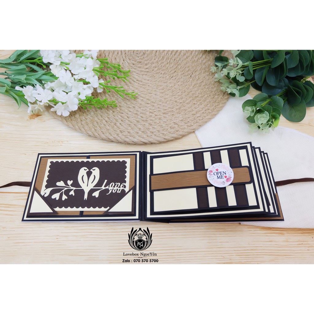 Nếu bạn luôn mong muốn anh ấy nhớ đến những kỷ niệm đẹp và nhớ về bạn trong suốt thời gian quân ngũ thì một cuốn album có dán sẵn hình ảnh của cả hai sẽ là món quà hoàn hảo nhất. Cuốn Album Mini scrapbook màu nâu vừa đẹp vừa độc lạ được làm từ giấy kraft cứng định lượng 250gsm màu nâu chủ đạo, cuốn sổ có kích thước nhỏ gọn 13x18x4 cm, gồm 10 mặt kèm nhiều hiệu ứng độc đáo giúp bạn có thể dán ảnh lên một cách dễ dàng là sẽ có ngay một quyển album xinh xắn. Chắc chắn những bức hình này sẽ là nguồn động viên, an ủi để anh ấy vượt qua mọi thử thách trong môi trường quân đội đấy.