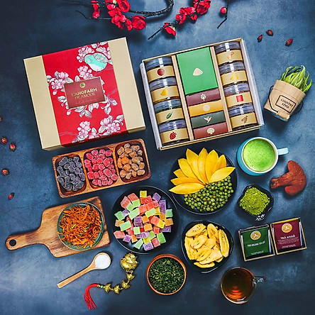 Set quà lục sắc bao gồm các món bánh kẹo khác nhau, tạo ra bức tranh đa màu rực rỡ cho mâm cỗ ngày Tết: Màu nâu của kẹo me cay, màu tím của kẹo dâu tằm, màu hồng của kẹo thập cẩm, màu vàng của xoài sấy dẻo, màu cam của chuối sấy, màu xanh của đậu Hà Lan muối, đi cùng 5 vị trà độc lạ đến từ Việt, Trung và Nhật Bản, tạo nên bữa tiệc tuyệt vời về hình thức lẫn hương vị!