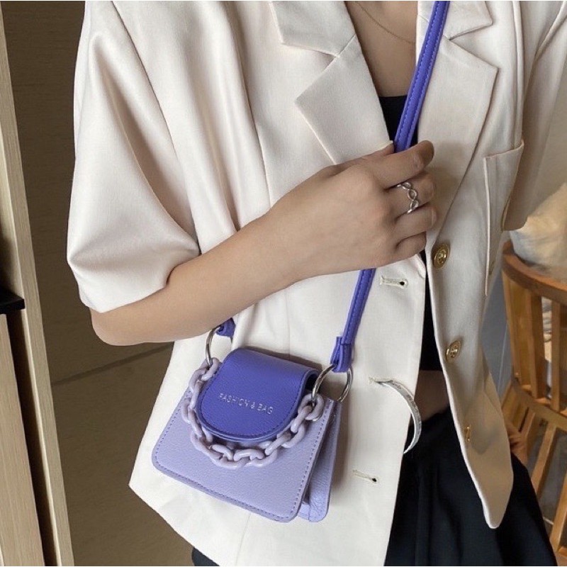 Một mẫu túi đeo mini phù hợp với cả các bạn học sinh, sinh viên cho đến các nhân viên văn phòng, công chức hay những người phụ nữ thành đạt, hiện đại chính là mẫu túi đeo mini dây xích phối màu thời trang này. Túi được thiết kế theo phong cách Hàn Quốc với các màu sắc là tím, xanh, cam, trắng. Chất liệu túi là da tổng hợp PU, đường may cẩn thận, tinh tế, size mini 14cm x 9,5cm x 6,5cm, đựng vừa son, tiền và chìa khoá, tiện lợi khi đi chơi, đi hẹn hò, dạo phố, tạo cho các nàng nét sang trọng, nhẹ nhàng và thanh lịch.