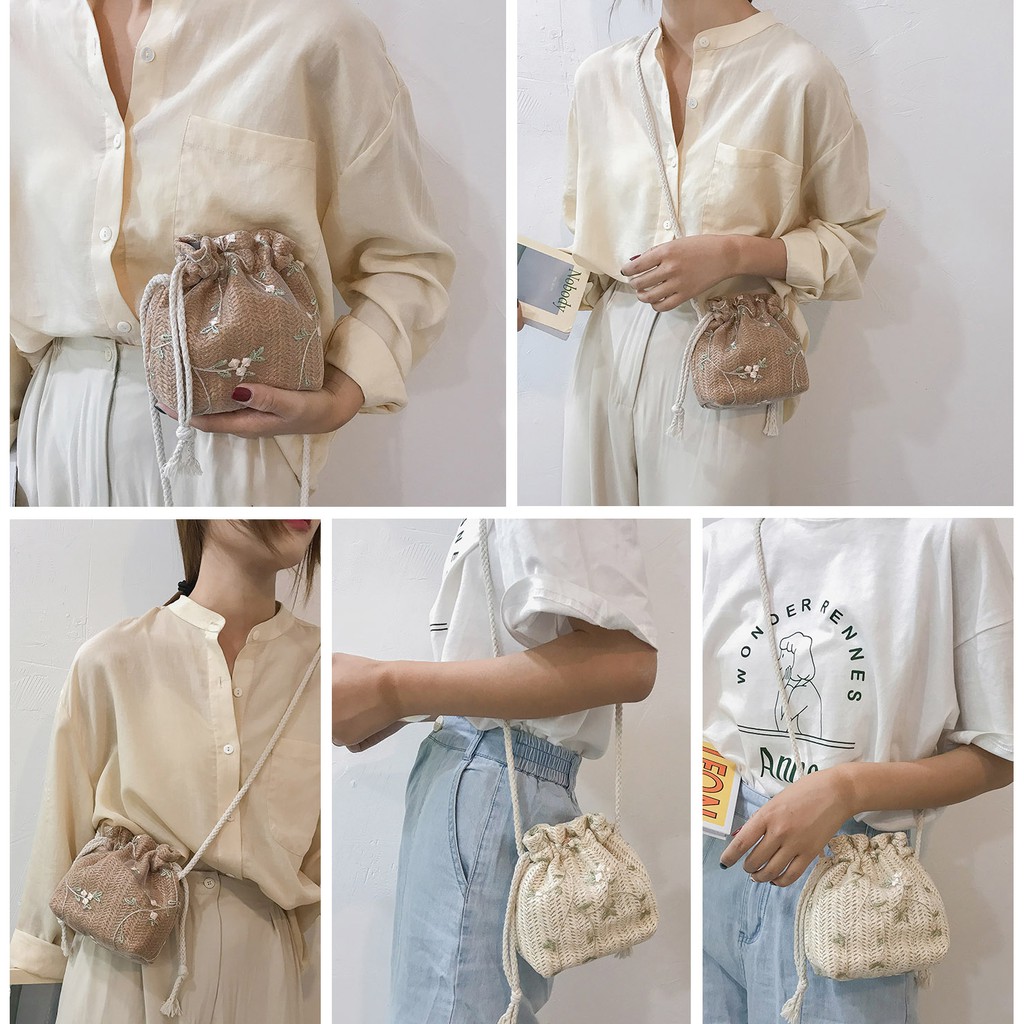 25. Túi cói đeo vai dáng xô dây rút phối ren dễ thương