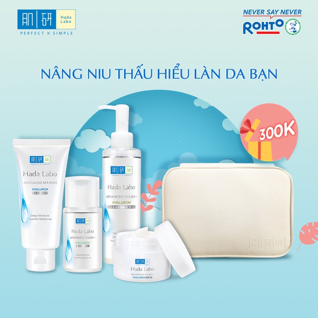 Bộ sản phẩm dưỡng ẩm tối ưu Hada Labo Advanced Nourish (gồm dầu tẩy trang 200ml + Kem rửa mặt 80g + dung dịch dưỡng 100ml + Kem dưỡng 50g) là một lựa chọn rất đáng để bạn xem xét. Hada Labo là dòng sản phẩm của Rohto – một thương hiệu nổi tiếng trong lĩnh vực dược phẩm tại đất nước mặt trời mọc. Với tiêu chí đem đến cho khách hàng “một làn da khỏe mạnh”, Rohto đã chú trọng vào các thành phần có tính năng cấp ẩm, loại bỏ tối đa các thành phần có thể gây hại cho da. Chính vì vậy bạn hoàn toàn có thể tin tưởng lựa chọn sản phẩm này cho nàng.