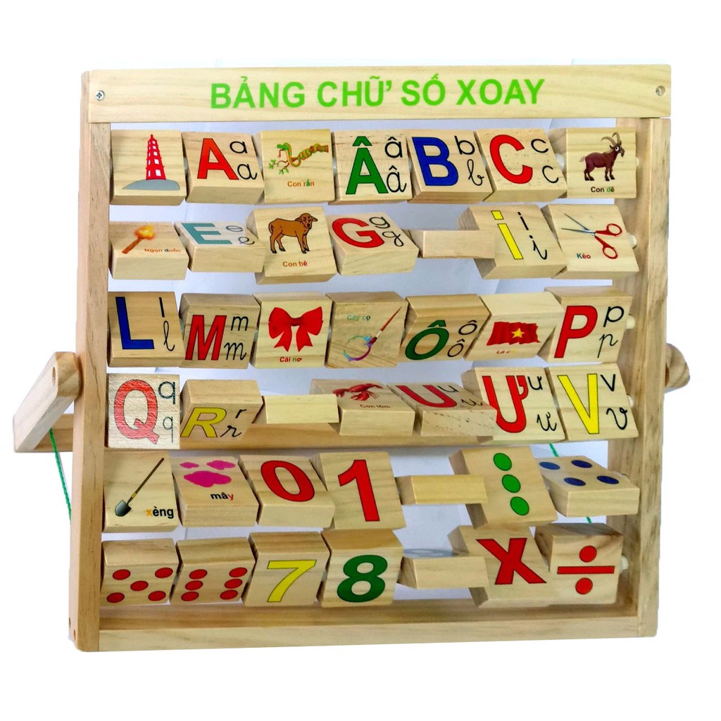 Bảng chữ cái tiếng Việt số xoay được thiết kế từ chất liệu gỗ, phía sau có chân chống chắc chắn. Bảng chữ cái sẽ là sự kết hợp giữa nhiều ô vuông có thể lật cả mặt trước và sau. Mỗi ô có kèm cả hình minh họa 3 dạng chữ thông dụng: chữ hoa, chữ in thường và chữ viết tay, bên mặt sau còn có từ vựng tương ứng. Bảng chữ cái giúp con ghi nhớ được mặt chữ, mặt số để làm hành trang cho bé chuẩn bị vào lớp 1.