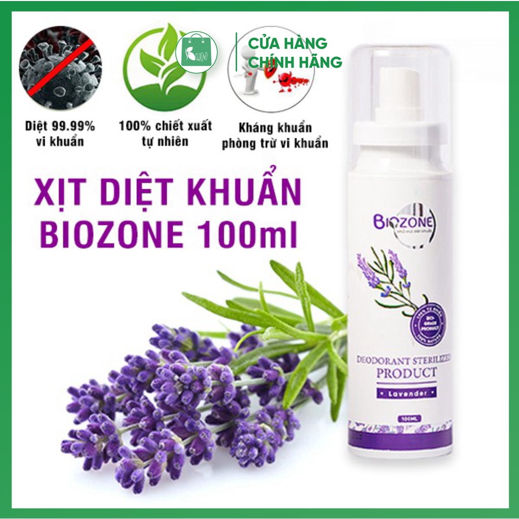 Biozone là một sản phẩm xịt khử khuẩn tự nhiên với khả năng diệt 99.99% vi khuẩn đã được kiểm định và cấp phép lưu thông bởi Bộ Y tế. Sản phẩm có mùi hương của hoa lavender hoặc hoa oải hưởng rất nhẹ nhàng, đem lại cảm giác thoải mái.