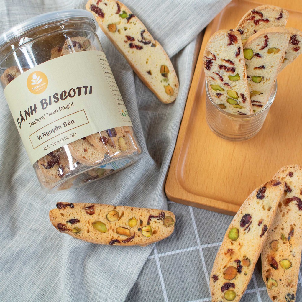 Bánh quy Biscotti vị nguyên bản là sản phẩm có nguồn gốc ở Ý, thường được người Ý dùng vào buổi sáng và kết hợp với một tách espresso. Bánh quy Biscotti được sản xuất và chọn lựa từ những nguyên liệu hoàn toàn tự nhiên gồm hạt lúa mỳ tươi kết hợp với các loại hạt, trái cây khô cao cấp để tạo nên một sản phẩm vô cùng đặc biệt. Những chiếc bánh quy của Biscotti đều có kích thước đồng đều, mang hương vị thơm ngon, giòn tan, kích thích khẩu vị của tất cả mọi người. Bánh quy Biscotti là sản phẩm cung cấp nhiều chất xơ, khoáng chất, vitamin, mang lại một nguồn năng lượng dồi dào để bắt đầu một ngày mới đầy hứng khởi.