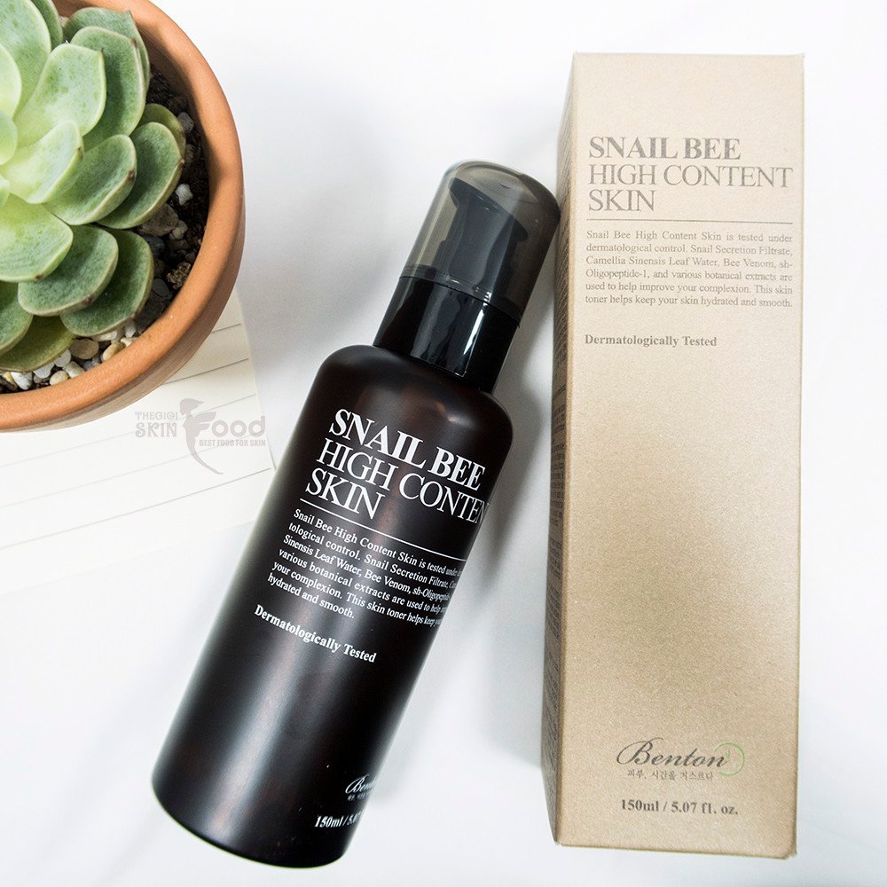 Nước hoa hồng phục hồi, làm dịu da Benton Snail Bee High Content Skin 150ml đến từ thương hiệu Benton của Hàn Quốc. Nước hoa hồng phục hồi, làm dịu da Benton Snail Bee High Content Skin là sự kết hợp độc đáo giữa dịch nhầy ốc sên và "botox tự nhiên” Bee Venom, rất giàu dinh dưỡng, có khả năng giữ nước cao, làm mềm, làm ẩm làn da khô ráp một cách nhanh chóng, giúp bơm đầy rãnh nhăn, tạo độ căng bóng đàn hồi cho làn da, đồng thời làm chậm quá trình lão hóa. Bee Venom là một acid chứa nhiều peptide và khoáng chất giúp làm giảm căng thẳng cơ mặt và tăng cường tổng hợp Collagen, cùng với nước trà xanh, chiết xuất rễ hoa thục quỳ và lô hội.