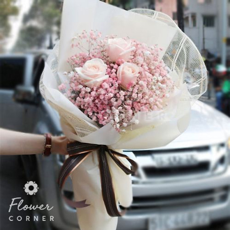 Bó hoa tình yêu chính là gợi ý cho bạn hôm nay. Món quà được thiết kế từ 3 cành hồng kem cùng với hoa baby phun hồng gói trong giấy gói xinh xắn tạo nên bó hoa tinh tế hài hòa. Tone hồng kem nhẹ nhàng mà thanh nhã tạo nên ý nghĩa về tình yêu đôi lứa sẽ luôn tươi đẹp, tinh khiết như buổi ban đầu. Ngoài ra món quà còn thể hiện sự khen ngợi về cô gái bạn yêu nữa đấy.