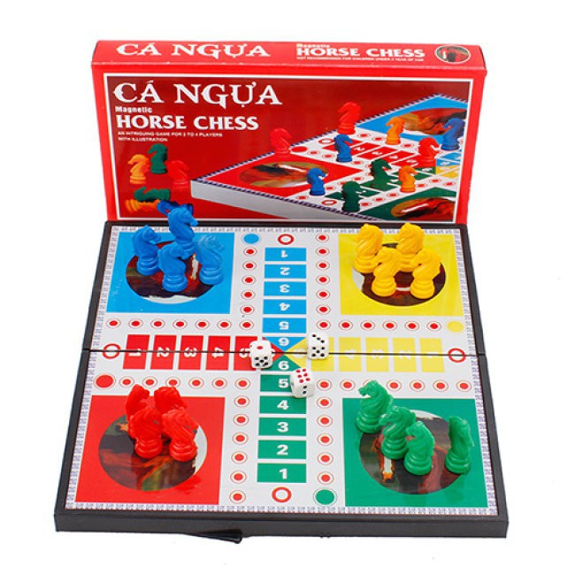 Trò cá ngựa rất thích hợp chơi trong gia đình, hoặc nhóm bạn nhỏ từ 2 - 4 người. Người chơi sẽ lựa chọn màu cá ngựa mình thích, rồi đổ xúc xắc và đi, đổ được bao nhiêu thì cá ngựa sẽ tiến bấy nhiêu bước, nếu số bước của bạn trùng chỗ với người trước thì có quyền đá “cá ngựa” của họ về chuồng. Người nào đưa được cả 4 em cá ngựa về đích trước là thắng. Đây là trò rất tốt cho trẻ em, sẽ giúp các bé luyện nhanh tay và nhanh mắt. Bạn có thể mua bộ cờ cá ngựa tại Nhà Sách Tân Phú nhấn vào đây với giá là 150.000 VND. Bộ cờ có kích thước bàn là 440x440mm và được thiết kế các góc tròn an toàn với mọi người.
