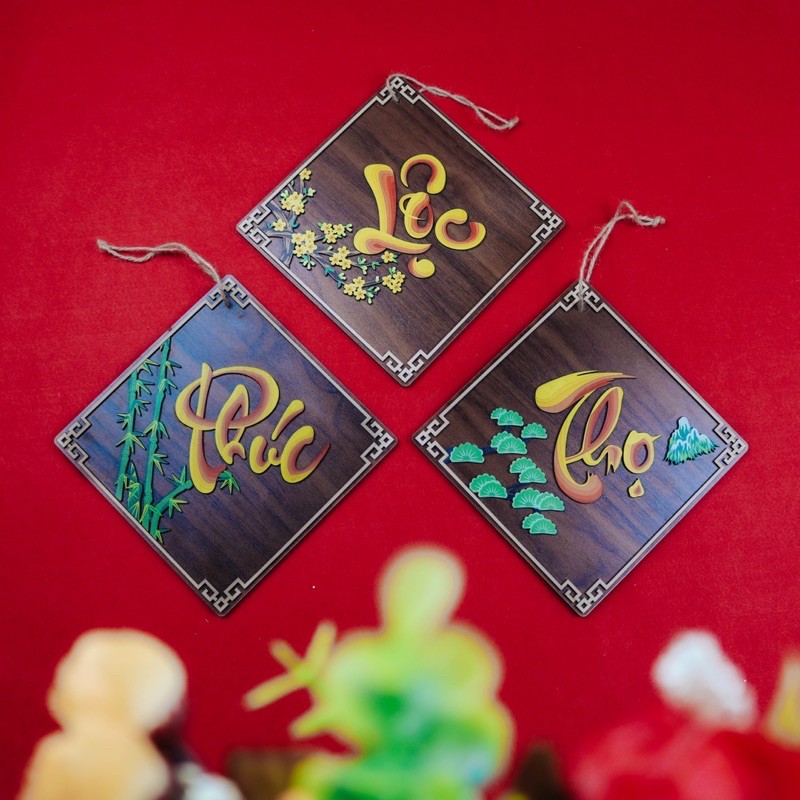 Vào dịp Tết cổ truyền, ba chữ Phúc, Lộc, Thọ mang ý nghĩa cầu chúc được bình an, tiền tài, sung túc, cũng là nhắc nhở phải sống tốt, sống đẹp. Hiện nay combo 3 bảng gỗ phúc lộc thọ trang trí Tết đang được bán trên Shopee với giá chỉ 199.000 VND. Sản phẩm được làm từ gỗ MDF phủ malamine và gỗ veneer cao cấp, kết hợp chữ thư pháp được vẽ từ màu sắc tươi tắn không trôi, tạo nên một tổng thể ấn tượng, bắt mắt và hài hoà. Kích thước một bảng là 21.5 x 21.5cm, không chiếm nhiều diện tích treo. Bạn có thể đặt mua ngay bằng cách nhấn vào đây.