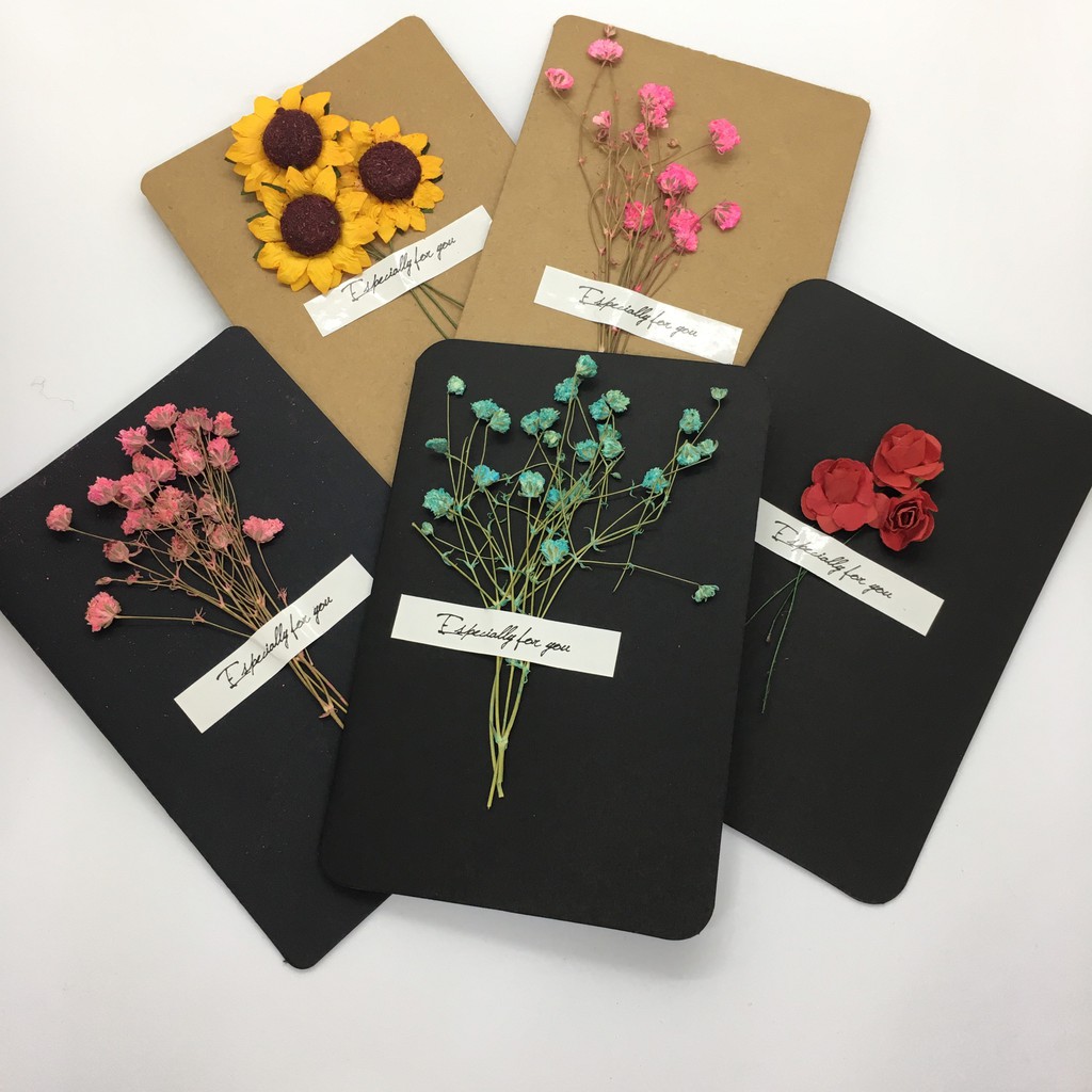 Thiệp handmade hoa khô sẽ là một gợi ý cho bạn. Tấm thiệp có kích thước 15x10cm với thiết kế gập đôi đơn giản trang trí những bông hoa ép khô trên nền giấy bìa draft cao cấp màu vàng hoặc màu đen. Bạn hãy sử dụng bút nhũ để viết lên những lời nhắn nhủ tới những người bạn đáng yêu, màu mực nhũ sẽ thật nổi bật trên nền giấy draft đấy.