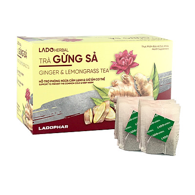 Trà gừng sả Ladophar hộp 20 túi lọc là một sản phẩm với nguồn gốc xuất sứ từ Việt Nam với thành phần gồm sả, gừng tươi, cỏ ngọt giúp giảm bớt các triệu chứng đau bụng do cảm lạnh, giải cảm, giữ ấm cơ thể.