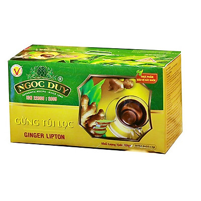 Trà gừng gói túi lọc Ngọc Duy là một sản phẩm được chiết xuất từ 100% gừng tươi, rất tốt cho sức khỏe với khả năng ôn trung, trực hà, giảm bớt các triệu do cảm lạnh gây ra,... Trà được đóng thành túi lọc với mỗi túi có khối lượng khoảng 1.5g.