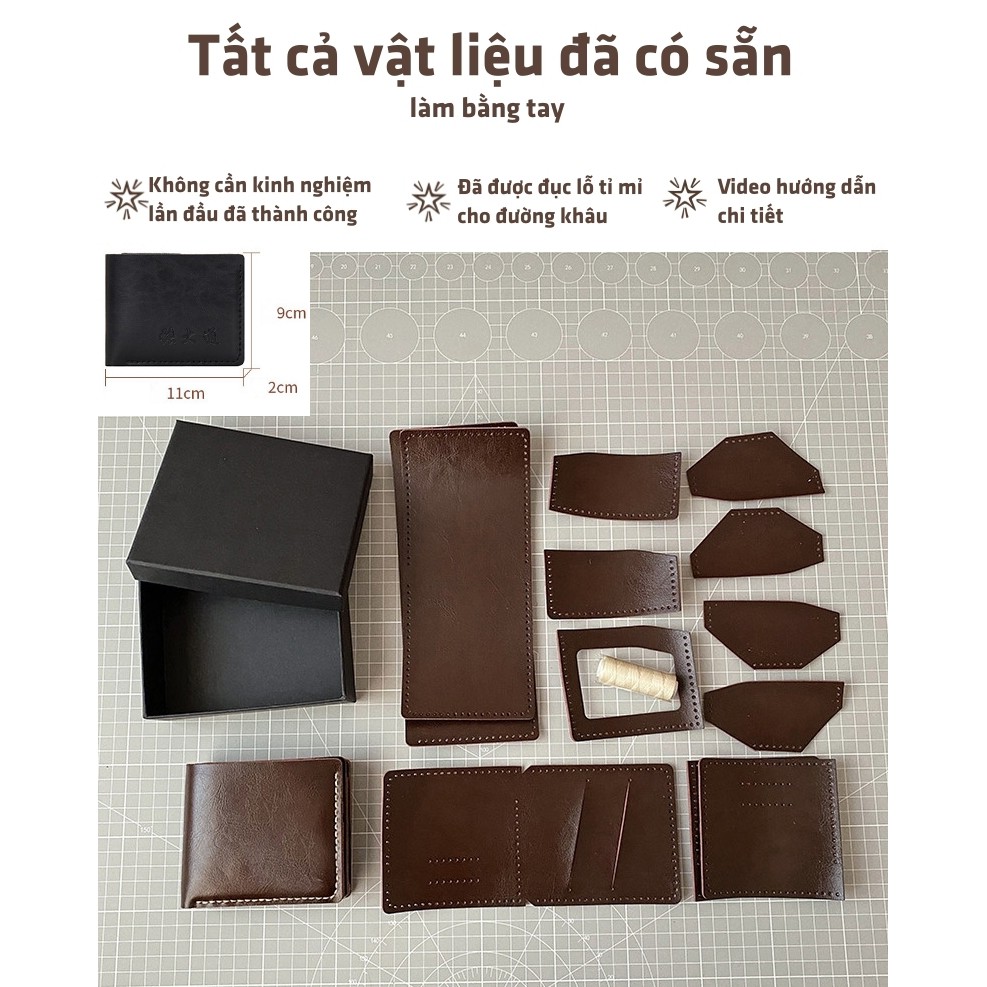 Chất liệu da của set túi da tự may handmade này được làm từ da PU có độ bền cao với màu nây mang vẻ trẻ trung nhưng cũng không kém phần lịch lãm. Ngoài ra, bên trong set sản phẩm còn nhiều nguyên liệu như kim, chỉ, kéo, giúp bạn tự mình kết nối chiếc ví từ chi tiết nhỏ nhất đến lớn nhất dưới sự kiên trì, tỉ mẩn của bản thân. Ví có kích thước là 11 x 9 x 2 cm.