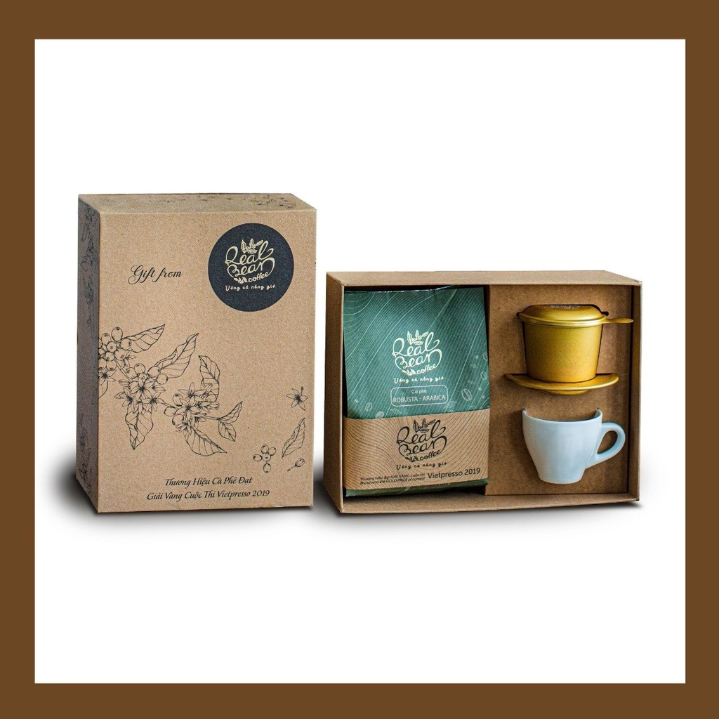 Cà phê hộp quà tặng Real Bean Coffee chính là món quà tặng của những sự yêu thương. Cà phê được sản xuất từ những hạt cà phê rang xay nguyên chất tại vùng Lâm Đồng, Đăk Lăk. Đi cùng với gói quà tặng cà phê sẽ là phin pha cà phê làm từ nhôm chịu nhiệt tốt an toàn với sức khỏe người tiêu dùng và một tách sứ nhỏ nhâm nhi ly cà phê.